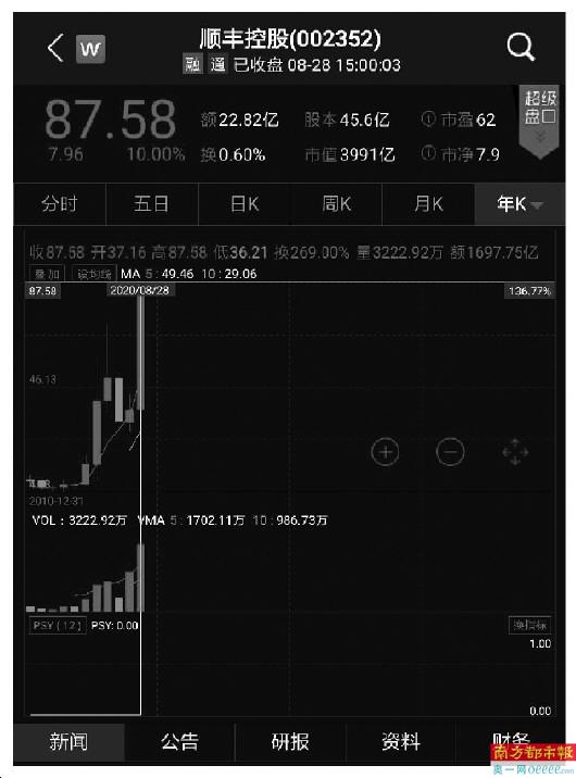 南都讯 见习记者黄良东 近日,深圳快递巨头顺丰开启“狂飙模式”。受半年报业绩利好影响,三日内两度涨停,8月28日,顺丰股价又创新高,当日涨停报87.58元每股。今年以来,顺丰股价已经上涨136%,总市值达近4000亿元。