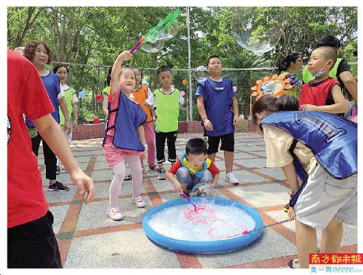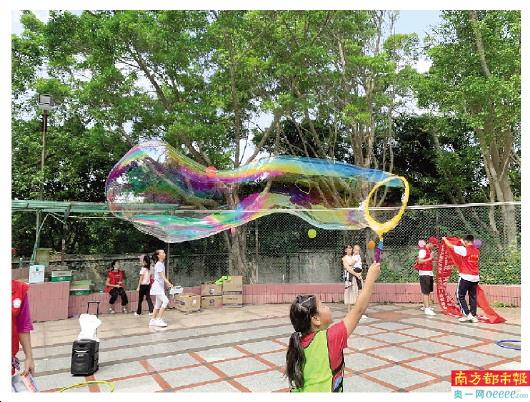 在精彩的亲子游戏任务完成后,每一位孩子都分到一个大大的泡泡圈,在一池泡沫水里玩起“魔幻泡泡秀”。蘸上满满的一层泡沫后,孩子们便举起泡泡圈绕着球场奔跑,一个个大大的泡泡龙摇晃着往上升,在光照下显得五彩缤纷、闪闪发光。