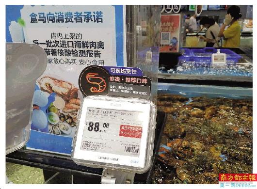 在商品方面,货物到店之前,会使用消毒液对外包装消毒,并做好货品的全链路溯源工作。在水产区,市民不难发现,每一缸生鲜的价格牌上,都贴有一个条形码,用盒马APP扫码,即可查看食品的捕捞地点、核酸检测结果报告、运输车辆等具体信息。“除了可视化溯源体系,我们还会用飞行检查的方式,到供应商加工现场查验货品,从源头保证产品品质。”林佳福补充道,所有上架的进口生鲜均做了核酸检测,确认检测结果为阴性才摆上货架。