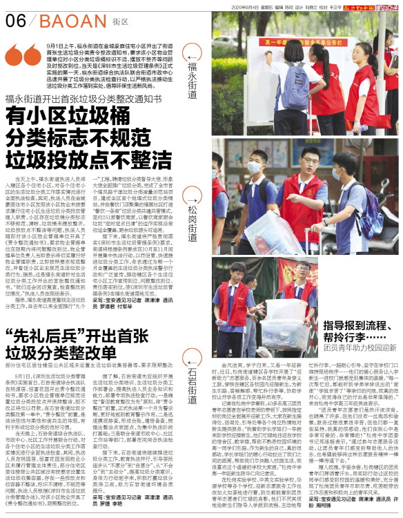 福永街道9月1日上午,福永街道在金域豪庭住宅小区开出了街道首张生活垃圾分类责令整改通知书,要求该小区物业管理单位对小区分类垃圾桶标识不清、摆放不整齐等问题及时整改到位。当天是《深圳市生活垃圾管理条