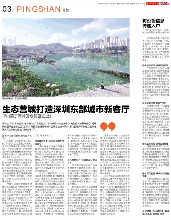 坪山区以“山水会客厅·活力新中心”为定位,以“不一样的公共生活中心、新型的创新服务中心、高品质的国际生活新社区”为目标,高标准推进燕子湖片区综合性城市设计,着力打造深圳东部乃至粤港澳大湾区东部地区的“