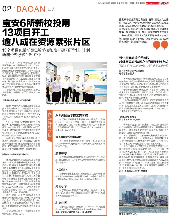 8月30日,2020年深圳市宝安区新校启用暨学校建设项目集中开工仪式在宝安区新桥街道上星学校举行。宝安区委书记姚任现场宣布6所新校启用、13个学校建设项目开工,发出了“学有优教”的宝安回应。据悉,举办