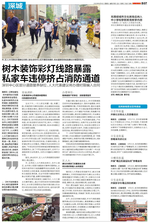 南都讯 记者张馨怡 树木装饰彩灯线路暴露带来安全隐患、私家车违停挤占消防通道、地面破损影响城市美观和交通混乱等现象,在深圳中心区颇为常见。在福田区第七届人民代表大会第六次会议上,《关于加快整治中心城区