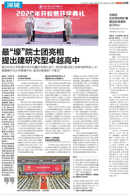 南都讯 记者朱倩 通讯员 许维静 李丽佳 程天星 9月3日上午10时,南方科技大学附属中学(简称“南科大附中”)2020年开校暨开学典礼于南科大附中体育馆举行。今年学校首次招生即满额录取,录取分数线居