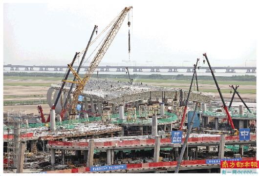 9月5日,记者在现场看到,深圳机场两条跑道中间的卫星厅工程建设现场一片火热。目前,卫星厅主体混凝土结构已经全面封顶,计划2021年交付使用,届时每年可为2200万人次旅客提供候机和中转服务。