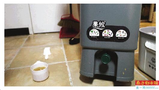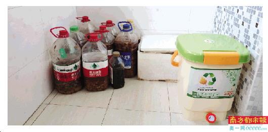 一走进厨房,就能看到灶台上挂着一个白色的小垃圾桶,王芸说,这里面一般装的都是生果皮或蔬菜等垃圾,这些没有油的生厨垃圾都是自己在家用“波西卡”堆肥桶堆肥处理。随后,王芸就从储物间拿出一个堆肥桶,里面已经堆了数天的肥料。“把这些没有油的生厨垃圾倒在里面,再加入一些EM菌就可以堆成肥。”王芸还启动按键,从桶里面流出液态肥,这些液态肥经地稀释后就可以浇花、浇菜等,“家里一般很少产生剩饭剩菜等厨余垃圾,基本上是光盘,除了一些骨头。”