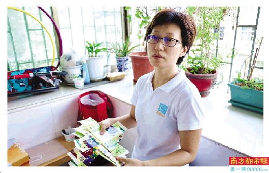 张珊珊展示自己分类的豆奶盒。
