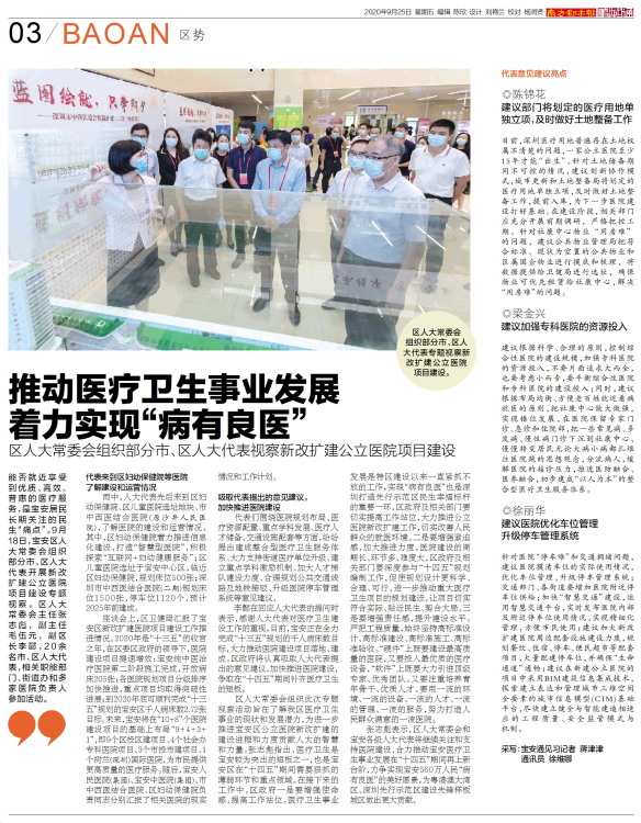 能否就近享受到优质、高效、普惠的医疗服务,是宝安居民长期关注的民生“痛点”。9月18日,宝安区人大常委会组织部分市、区人大代表开展新改扩建公立医院项目建设专题视察。区人大常委会主任张志彪,副主任毛伍元