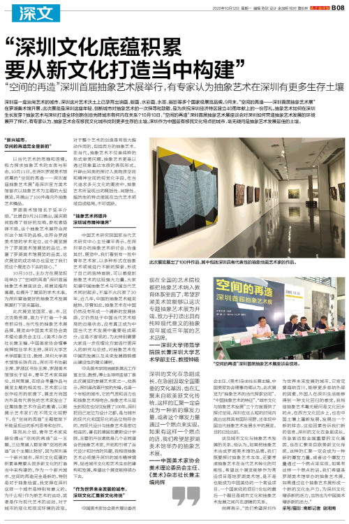 深圳是一座崇尚艺术的城市,深圳这片艺术沃土上已孕育出油画、版画、水彩画、水墨、摄影等多个国家级展览品牌。9月末,“空间的再造——深圳首届抽象艺术展”在罗湖美术馆开展,此次展览是深圳这座年轻、创新城市对