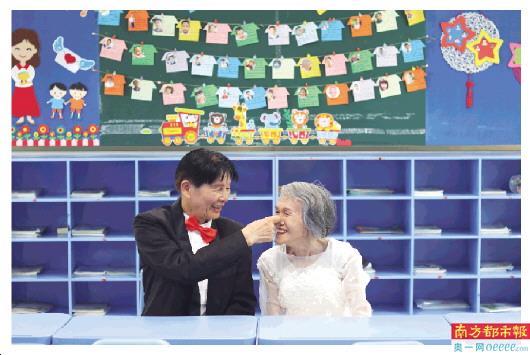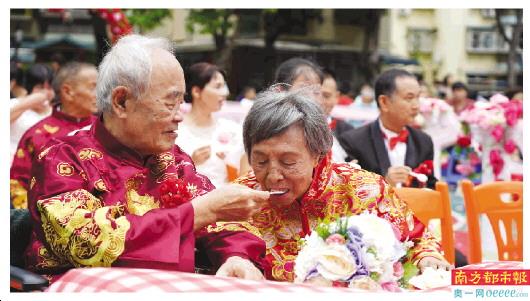 仪式现场,不少长者夫妇互相分享陪伴多年的故事。“我们当年的婚礼没有仪式,穿着军装、简单唱一首歌就正式结为夫妇。没想到年长之后,还能将当年缺了的那场婚礼办了。”老爷爷张志鸣说。为让甜蜜“加码”,老爷爷廖卫军还创作了一首自由体诗歌,表达对老伴李静的爱意,感谢她常年的陪伴。