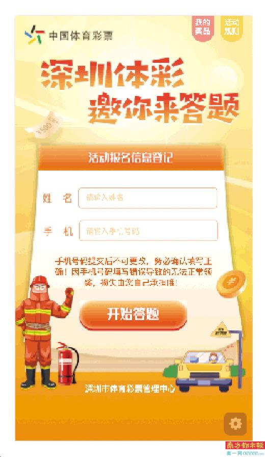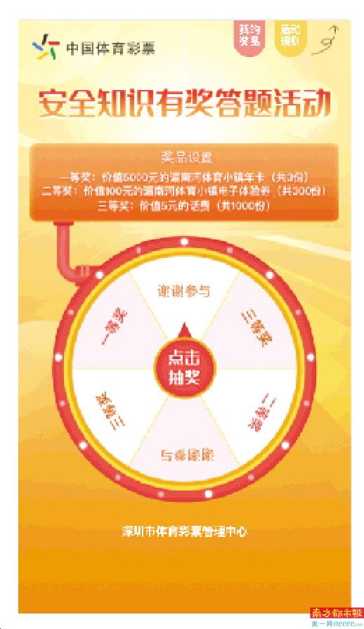为普及安全宣传基础知识,10月21日至11月9日(共20天),深圳体彩中心正式推出“深圳体彩安全宣传”答题互动H5,现特邀大家一起互动,学习安全知识,赢取缤纷好礼。