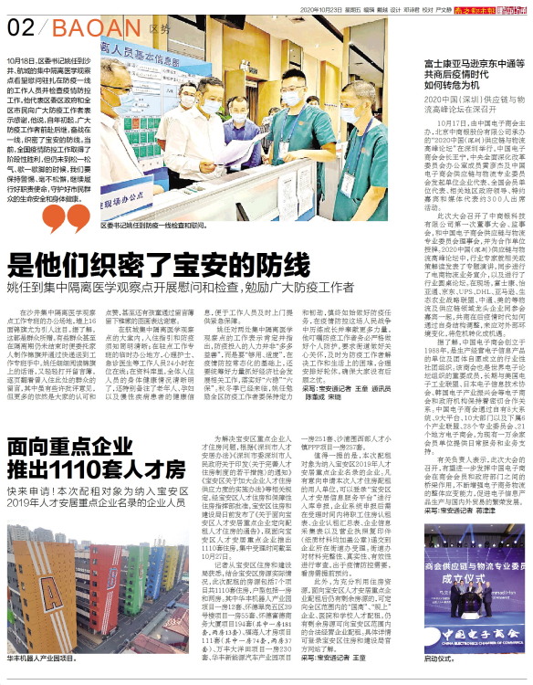 10月18日,区委书记姚任到沙井、航城的集中隔离医学观察点看望慰问驻扎在防疫一线的工作人员并检查疫情防控工作。他代表区委区政府和全区市民向广大防疫工作者表示感谢,他说,自年初起,广大防疫工作者前赴后继
