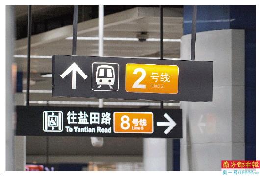 10月25日,深圳地铁2号线已经更换了导向标识,“8号线往盐田路”取代了原有的“2号线往新秀”。 南都记者 赵炎雄 摄