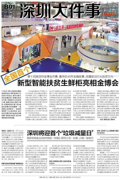11月2日,第十四届深圳国际金融博览会(简称金博会)正式举行开幕式,揭开为期三天的会展时间。参展机构近200家,同期举办论坛峰会13场。南都记者从现场了解到,本届金博会打造“深圳金融业发展40年成果展