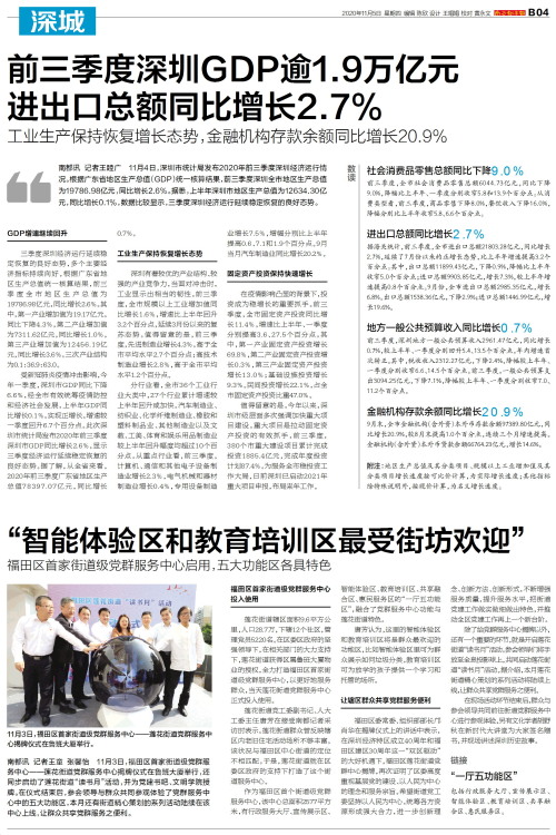 南都讯 记者王睦广 11月4日,深圳市统计局发布2020年前三季度深圳经济运行情况。根据广东省地区生产总值(GDP)统一核算结果,前三季度深圳全市地区生产总值为19786.98亿元,同比增长2.
