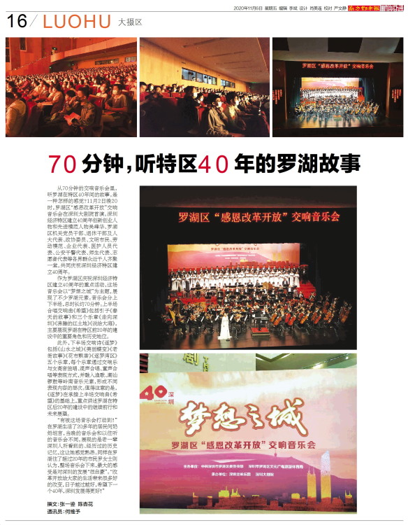 从70分钟的交响音乐会里,听罗湖在特区40年间的故事,是一种怎样的感觉?11月2日晚20时,罗湖区“感恩改革开放”交响音乐会在深圳大剧院首演。深圳经济特区建立40周年创新创业人物和先进模范人物吴峰华、