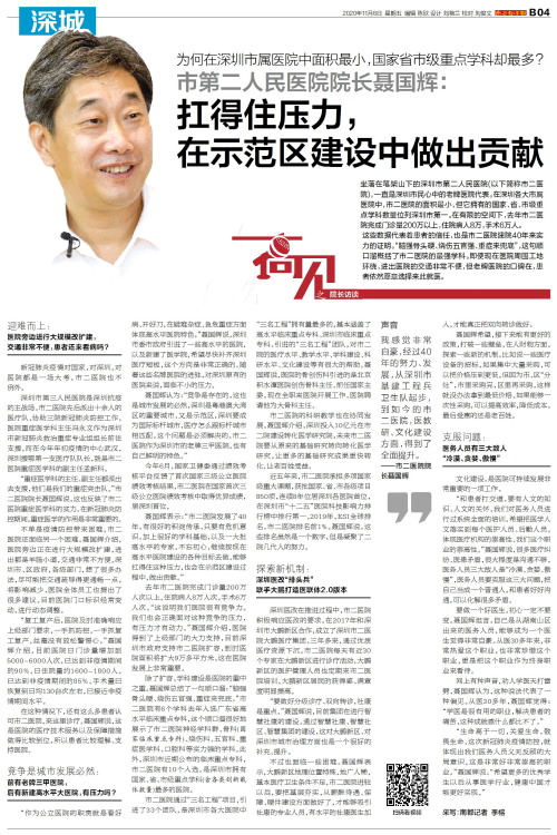 院长访谈坐落在笔架山下的深圳市第二人民医院(以下简称市二医院),一直是深圳市民心中的老牌医院代表。在深圳各大市属医院中,市二医院的面积最小,但它拥有的国家、省、市级重点学科数量位列深圳市第一。在有