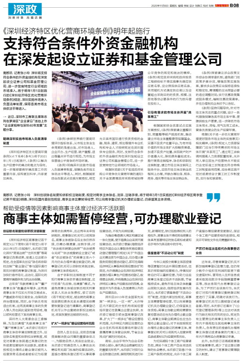 南都讯 记者张小玲 深圳将支持符合条件的外资金融机构在深发起设立证券公司和基金管理公司,进一步放宽特定行业领域的市场准入。将于明年1月1日起施行的《深圳经济特区优化营商环境条例》规定,深圳实施市场准入