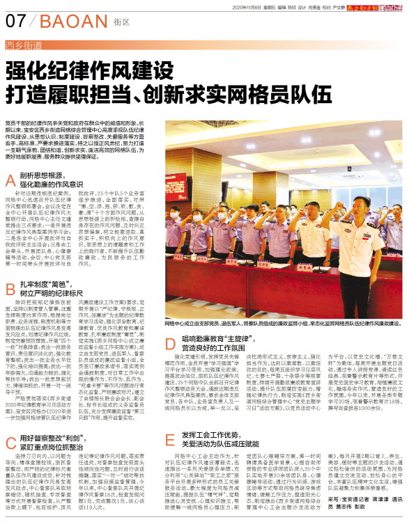西乡街道党员干部的纪律作风事关党和政府在群众中的威信和形象。长期以来,宝安区西乡街道网格综合管理中心高度重视队伍纪律作风建设,从思想认识、制度建设、督察整改、关爱服务等方面着手,高标准、严要求推进
