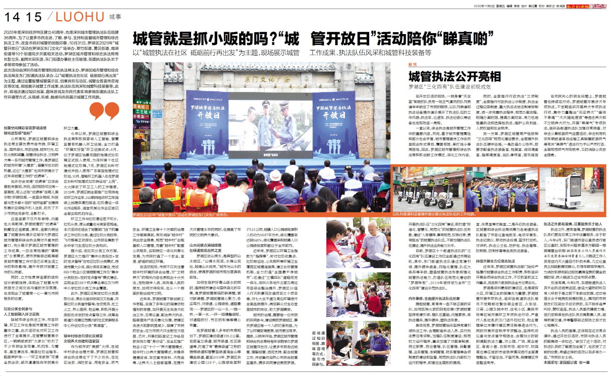 2020年是深圳经济特区建立40周年,也是深圳城市管理执法队伍组建36周年,为了让更多市民走进、了解、参与、支持和监督城市管理和综合执法工作,改变市民对城管的刻板印象,10月31日,罗湖区2020年“