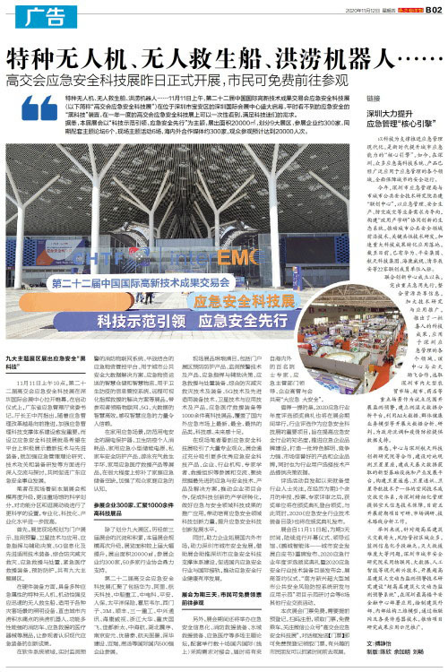 特种无人机、无人救生船、洪涝机器人……11月11日上午,第二十二届中国国际高新技术成果交易会应急安全科技展(以下简称“高交会应急安全科技展”)在位于深圳市宝安区的深圳国际会展中心盛大启幕,平时看不到的
