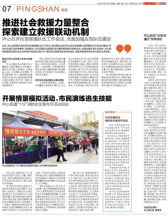 近日,坪山街道启动“119”消防安全宣传月活动,设置了模拟逃生、消防实操演练等互动项目,让市民参与到活动中,提升消防知识和技能。据了解,2020年坪山街道“119”消防安全宣传月活动主题为“关注消防、