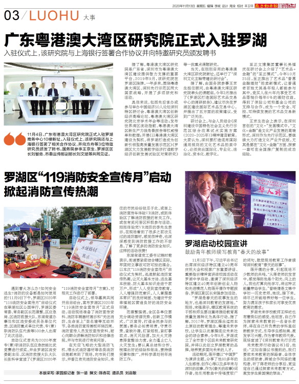 11月4日,广东粤港澳大湾区研究院正式入驻罗湖商务中心10楼新址。入驻仪式上,该研究院还与上海银行签署了相关合作协议,并向方舟等3位特邀研究员颁发了聘书。国务院参事王京生、罗湖区区长刘智勇、市委宣传部