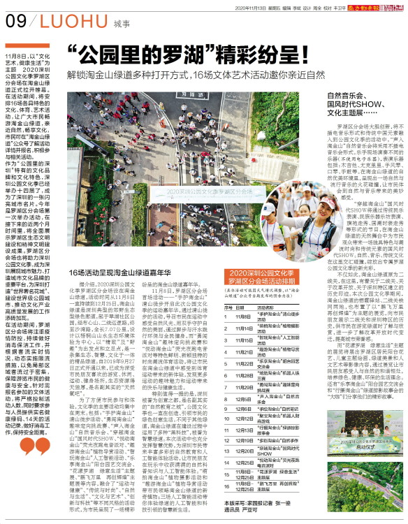 11月8日,以“文化艺术,健康生活”为主题 2020深圳公园文化季罗湖区分会场在淘金山绿道正式拉开帷幕。在活动期间,将安排16场各具特色的文化、体育、艺术活动,让广大市民畅游淘金山绿道,亲近自然,畅享