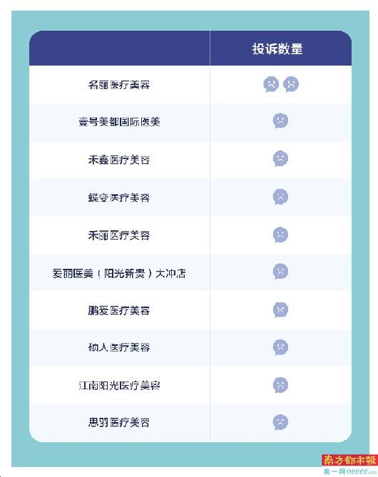 在上周的医疗消费投诉中,共有10家医美机构牵涉其中,包括:壹号美都国际医美有限公司、禾鑫医疗美容、蝶变医疗美容、禾丽医疗美容、名丽医疗美容、爱丽医美(阳光新贵)大冲店、鹏爱医疗美容、硕人医疗美容、江南阳光医疗美容、思羽医疗美容。