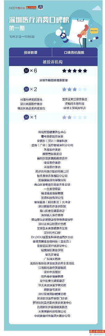 为发挥传统权威媒体的监督作用,也为消费者们提供更多信息上的参考,南都·深圳大件事结合互联网大数据、权威媒体报道,以及深圳消委会、黑猫投诉、南方舆情等各类平台信息,特推出每周一期的深圳医疗消费口碑榜,对深圳医疗消费热点事件及投诉进行收集和整理分析,同时开辟服务消费者的绿色投诉通道,助力医疗消费环境更透明更安全。