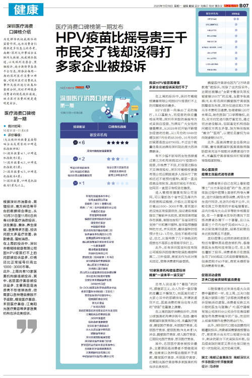 深圳医疗消费口碑榜介绍为发挥传统权威媒体的监督作用,也为消费者们提供更多信息上的参考,南都·深圳大件事结合互联网大数据、权威媒体报道,以及深圳消委会、黑猫投诉、南方舆情等各类平台信息,特推出每周一