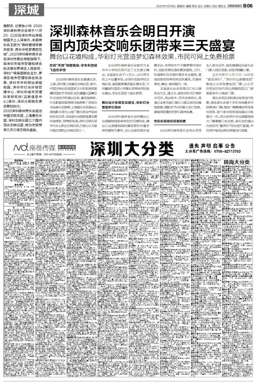 南都讯 记者张小玲 2020深圳森林音乐会将于11月20-22日在深圳市仙湖植物园天上人间举办。本届音乐会主题为“森林里续写春天故事,音乐中筑梦美丽花城”。2020深圳森林音乐会在深圳市委宣传部指导下