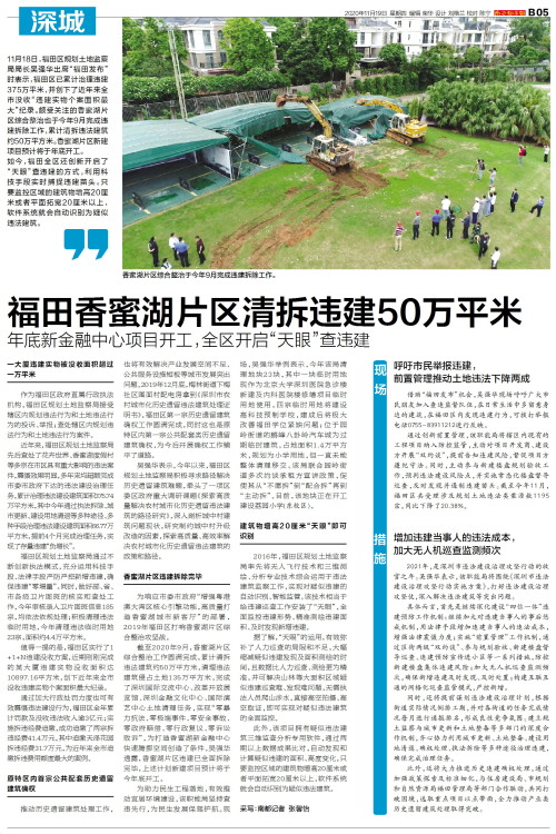 11月18日,福田区规划土地监察局局长吴强华出席“福田发布”时表示,福田区已累计治理违建375万平米,并创下了近年来全市没收“违建实物个案面积最大”纪录。颇受关注的香蜜湖片区综合整治也于今年9月完成违
