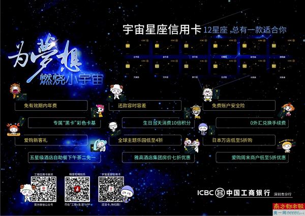 作为有追求有梦想的“新·深圳·人”,如何标榜自己的个性?彰显自己的魅力?这张来自中国工商银行倾力打造的“工银宇宙星座卡”,正是大有乾坤。在琳琅满目的信用卡里,它正是有颜值又有格调的“实力派选手”。那么,这张年轻人的专属“黑卡”到底长什么样?凭什么获得2018年“卡界奥斯卡”ICMA依兰奖颁发的含金量最高“最佳支付卡”奖项?现在,让我们通过这张特色信用卡,为“新·深圳·人”这个梦想IP赋予更生动的演绎,也更好读懂属于深圳人的“家园精神”与时代内涵。