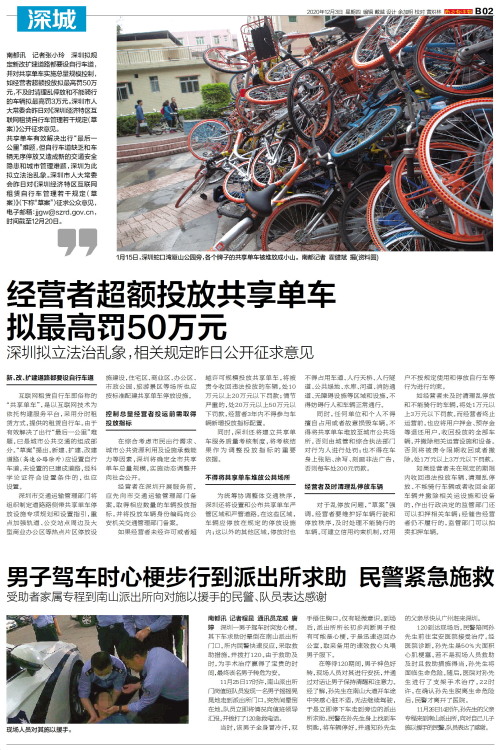 南都讯 记者张小玲 深圳拟规定新改扩建道路都要设自行车道,并对共享单车实施总量规模控制,如经营者超额投放拟最高罚50万元,不及时清理乱停放和不能骑行的车辆拟最高罚3万元。深圳市人大常委会昨日对《深圳经