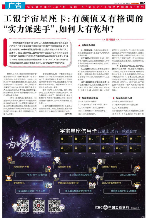 见证城市美好,与“新·深圳·人”同行之“工银特色信用卡”系列作为有追求有梦想的“新·深圳·人”,如何标榜自己的个性?彰显自己的魅力?这张来自中国工商银行倾力打造的“工银宇宙星座卡”,正是大有乾坤。