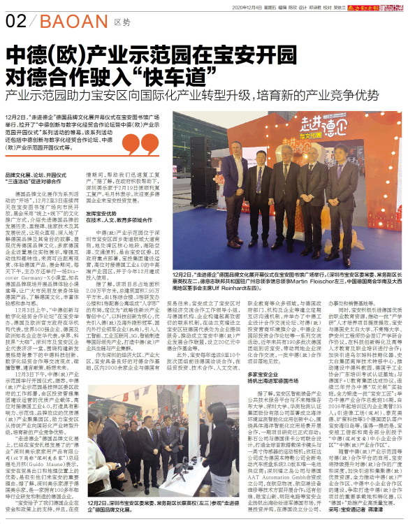 12月2日,“走进德企”德国品牌文化展开幕仪式在宝安图书馆广场举行,拉开了“中德创新与数字化经贸合作论坛暨中德(欧)产业示范园开园仪式”系列活动的帷幕。该系列活动还包括中德创新与数字化经贸合作论坛、中