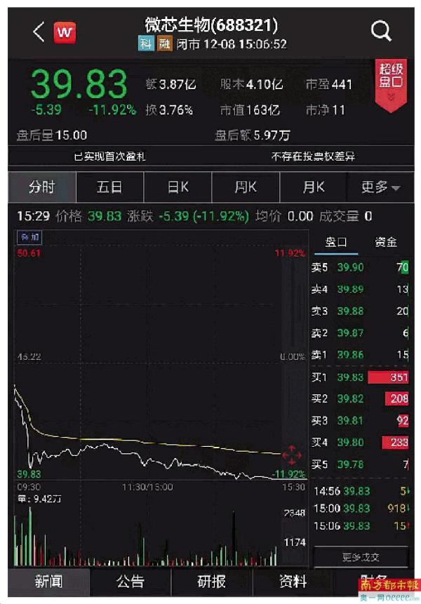 据南都记者了解,2019年8月12日上市交易的微芯生物曾是科创板大牛股,也是第二批上市的科创板个股,发行价为20.43元/股。上市首日,微芯生物受到市场追捧,开盘暴涨超过500%,报125元/股,创下了当时科创板个股开盘涨幅的最高纪录,公司发行市盈率高达467倍。但此后,微芯生股价进入快速下行通道,近期更显颓势。据wind数据统计,相比7月14日每股82.89元的股价小高峰,微芯生物股价5个月跌超一半。