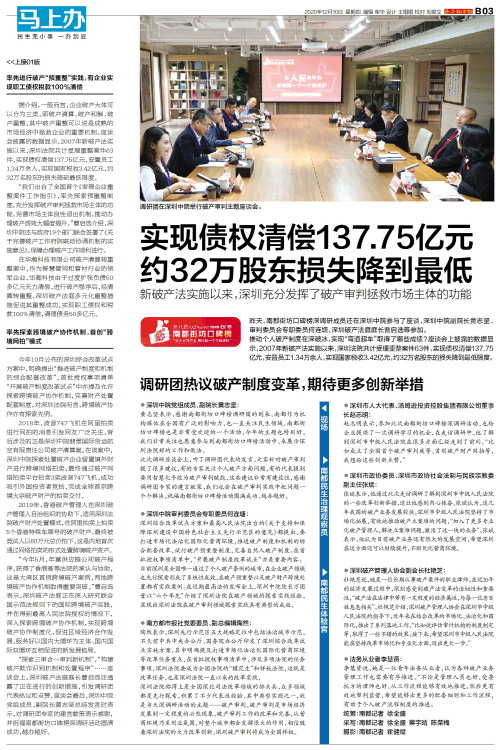 昨天,南都街坊口碑榜深调研成员还在深圳中院参与了座谈,深圳中院副院长黄志坚、审判委员会专职委员何连塘、深圳破产法庭庭长曹启选等参加。推动个人破产制度在深破冰,实现“弯道超车”取得了哪些成绩?座谈会上披