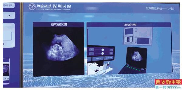 虚拟现实实验室。戴上VR眼镜,拿着B超探头放在教学模具上,眼前出现一幅孕妇早孕期影像。突破时间、空间的限制,北大深圳医院的VR超声教学非常逼真地还原了B超医生平时的工作状态,减少了对患者就医的打扰,却强化了对年轻医生的培训、考核。