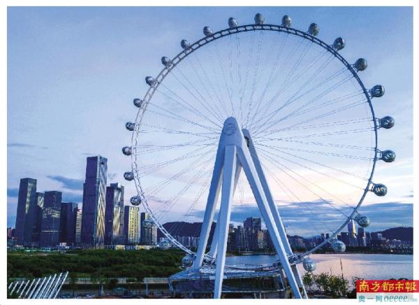 矗立在深圳市宝安区滨海文化公园,高达128米的“湾区之光”摩天轮,重构了湾区的天际线。