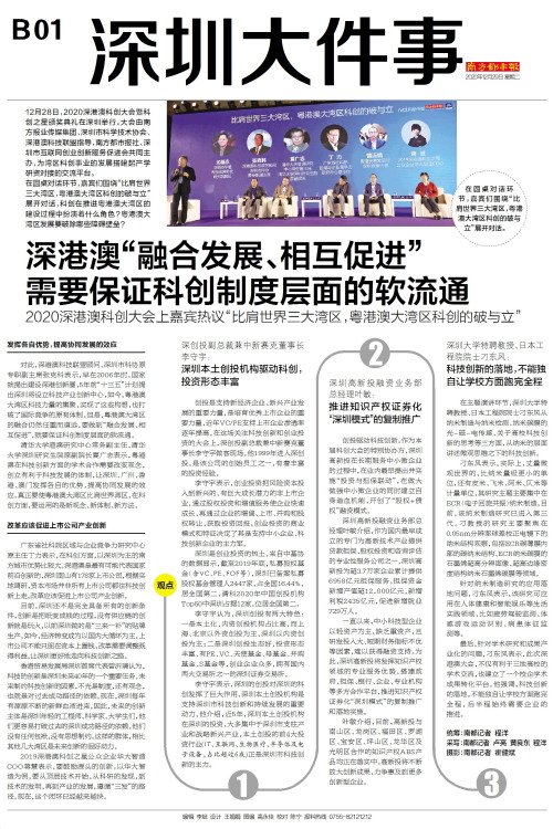 在圆桌对话环节,嘉宾们围绕“比肩世界三大湾区,粤港澳大湾区科创的破与立”展开对话。 12月28日,2020深港澳科创大会暨科创之星颁奖典礼在深圳举行。大会由南方报业传媒集团、深