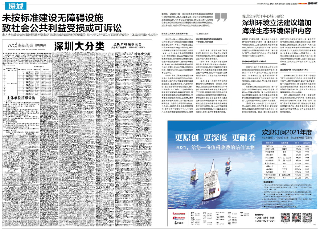 南都讯 记者张小玲 深圳拟将未按照无障碍标准规范进行建设或者损坏、侵占无障碍设施,致使社会公共利益受到损害的行为纳入民事公益诉讼范围,昨日提交市人大常委会审议的《深圳经济特区无障碍城市建设条例(草案)