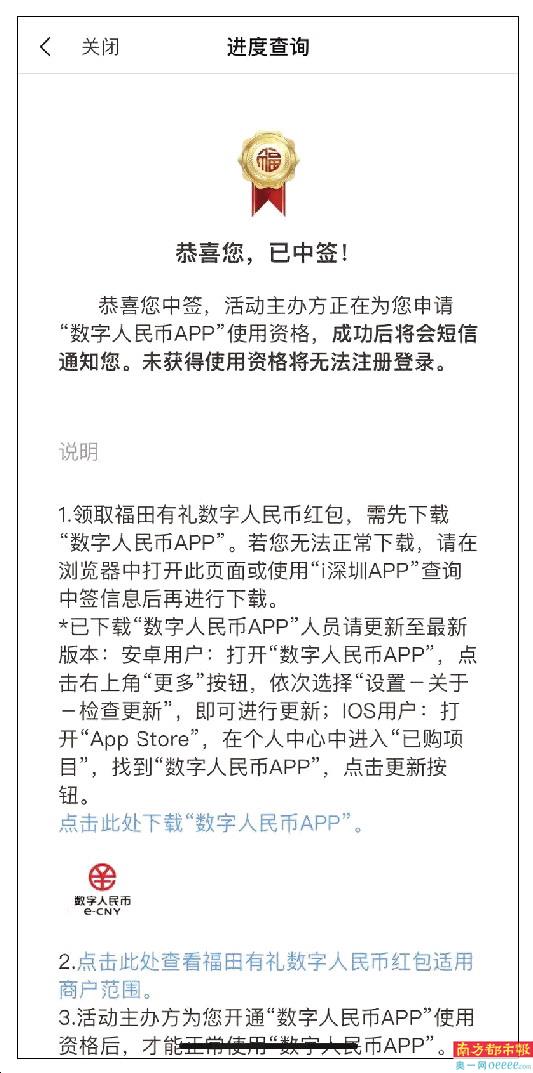 红包将于1月7日上午8时起发放,中签人员也将于1月7日8时起收到中签短信。根据中签短信指引,下载安装“数字人民币APP”,注册登录并开立预约时所选银行的“个人数字钱包”后,即可领取“福田有礼数字人民币红包”200元。