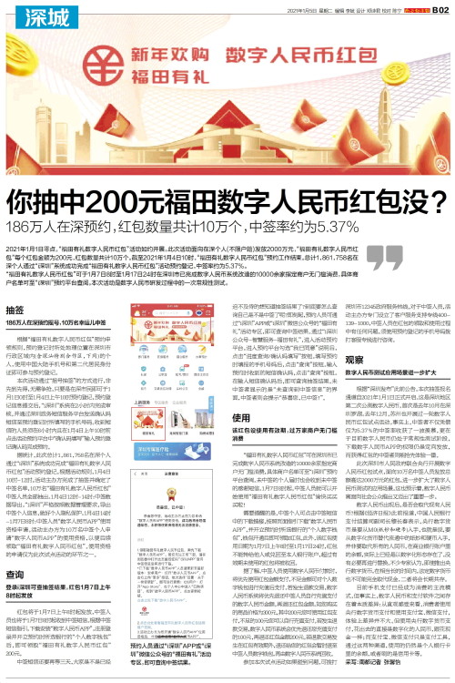 2021年1月1日零点,“福田有礼数字人民币红包”活动如约开展。此次活动面向在深个人(不限户籍)发放2000万元,“福田有礼数字人民币红包”每个红包金额为200元,红包数量共计10万个。截至2021年