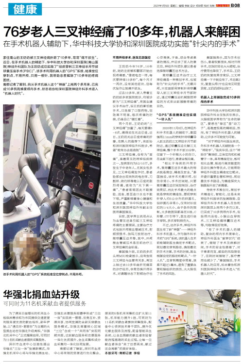 家住南山的王奶奶被三叉神经痛折磨了10多年,常常“痛不欲生”。近日,在手术机器人的辅助下,华中科技大学协和深圳医院(南山医院)神经外科团队为王奶奶成功实施了“经皮穿刺三叉神经半月节微球囊压迫手术(PB