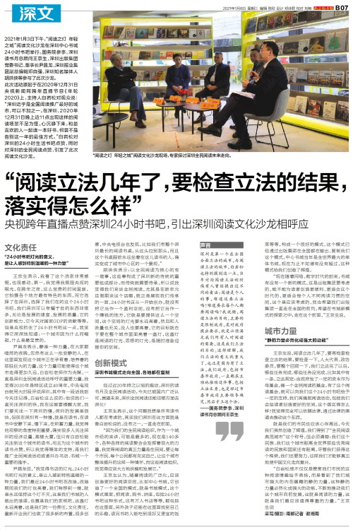 2021年1月3日下午,“阅读之灯 年轻之城”阅读文化沙龙在深圳中心书城24小时书吧举行。国务院参事、深圳读书月总顾问王京生,深圳出版集团党委书记、董事长尹昌龙,深圳报业集团副总编辑邓自强,深圳知名媒