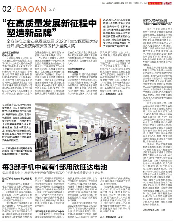 2020年12月29日,宝安区质量大会召开。区委书记姚任,区委副书记、区长王立德,深圳市市场监督管理局局领导李平出席会议并为获宝安区区长质量奖的企业颁奖。姚任在会上强调,要坚持高质量发展导向,全方位推