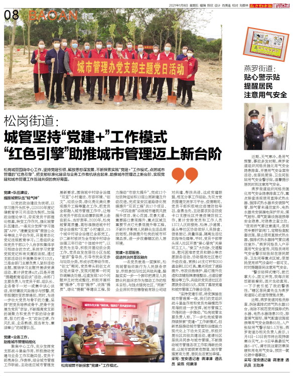 松岗城管围绕中心工作,坚持党建引领,解放思想谋发展,不断探索实践“党建+”工作模式,点燃城市管理的“红色引擎”,把支部标准化建设与业务工作有机结合起来,助推城市管理迈上新台阶,实现党建和城市管理工作互