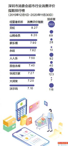 春节将至,年货市场消费将迎来高峰,后疫情时代,作为民生保障消费最基础的行业,超市行业线上订单需求呈增长态势,同时也存在线上业务模式不够成熟、物流配送服务质量待提升、消费体验不友好等问题。为加强对商品和服务的社会监督,为消费者提供高效、便捷的诉求响应及解决通道,2021年1月8日,深圳市消费者委员会(以下简称“深圳市消委会”)公开发布超市行业消费评价指数排行榜,包括天虹、山姆会员、家乐福等9大连锁超市品牌。